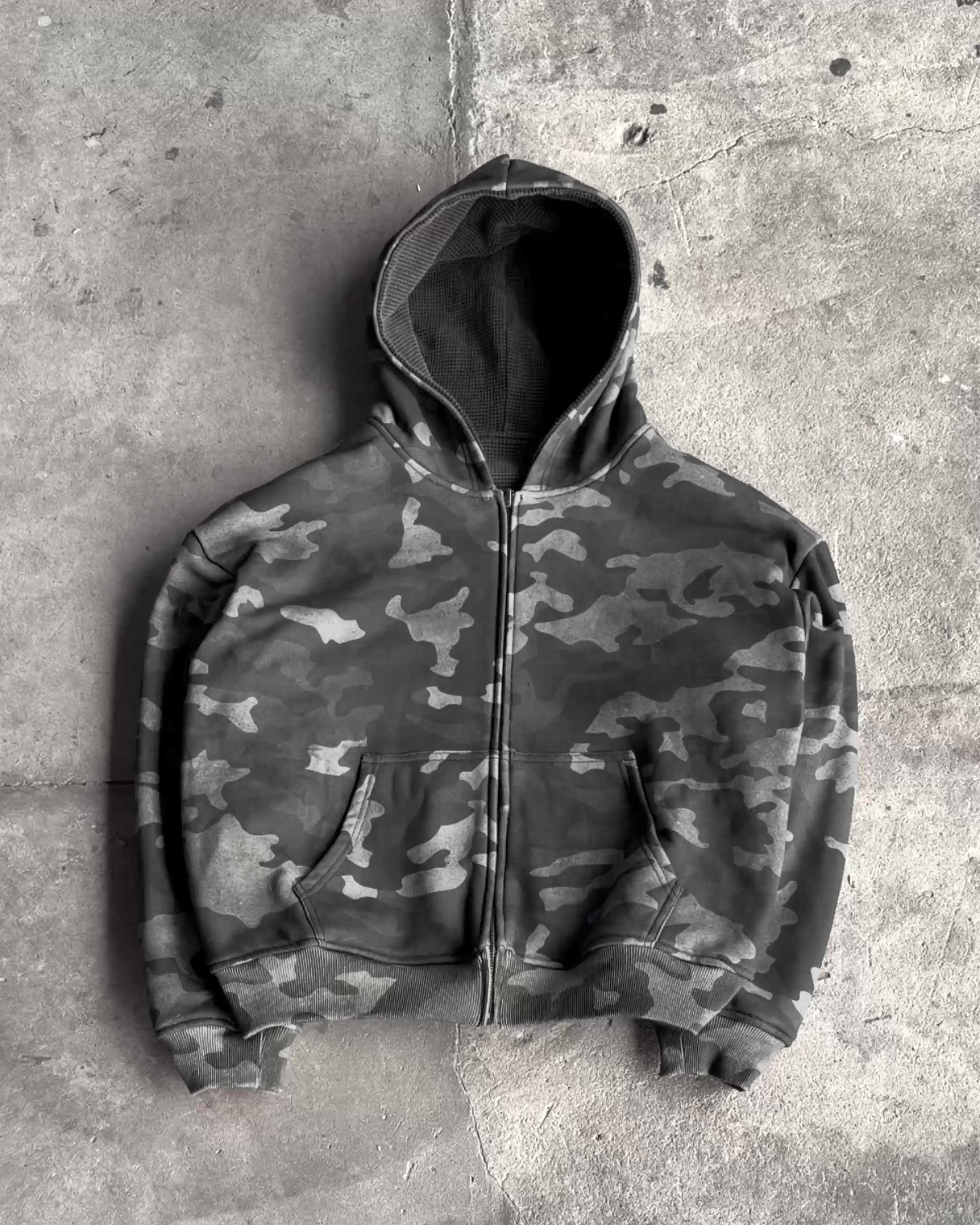 A fully reversible 2-in-1 hoodie, designed to give you two complete looks in one piece — a thermal-textured side with DTG artwork, and a full camo reverse.